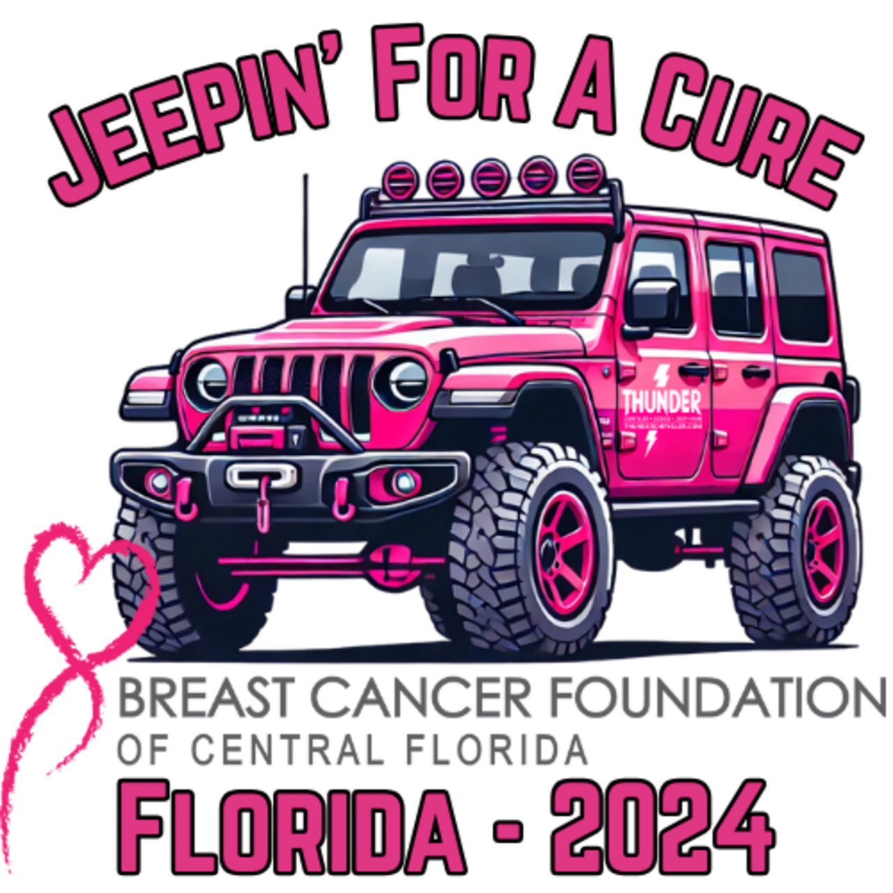 Jeepin for a Cure is a group that plans Jeep events to raise money to help families battling breast cancer. Our charity of choice is The Breast Cancer Foundation of Central Florida. Please use this link to make donations, register for the ride, or sign up for a sponsorship!This year's event is being held on Saturday, October 5th.Special thanks to our wonderful partner and this year's host, THUNDER Chrysler Dodge Jeep Ram!